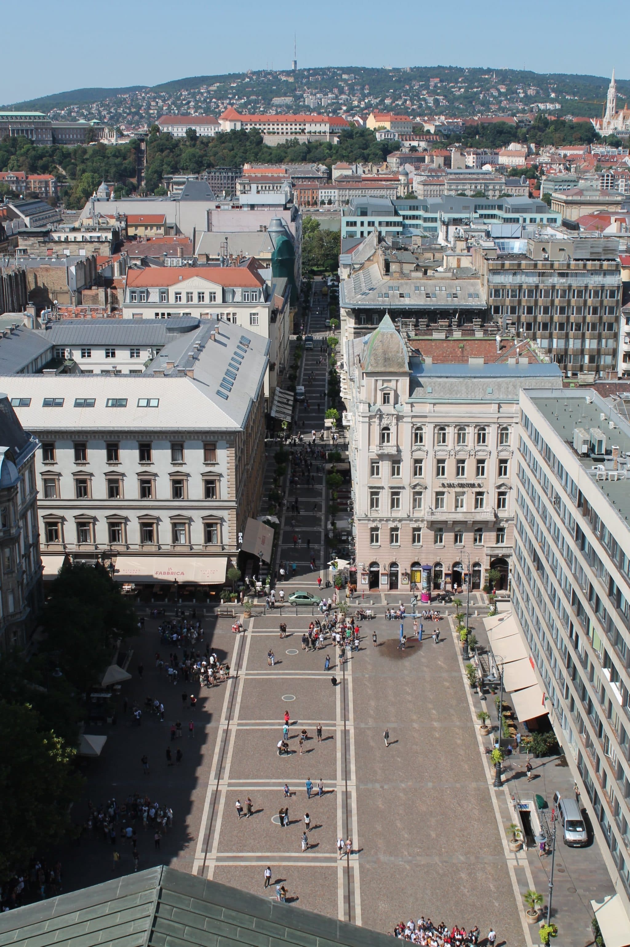 En continuant notre visite vers le sud, on passe par Erzsébet ter, une grande place verdoyante avec une jolie pièce d’eau. Cette place se trouve juste à côté d’un point central dans Budapest : Deak Ferenc ter. Ici, trois lignes de métro se retrouvent ainsi que de nombreuses lignes de bus, dont la ligne 100 E qui vient et va à l’aéroport. S’il faut patienter pour quelques raisons que ce soit, vous allez profiter d’Erzsebet ter.