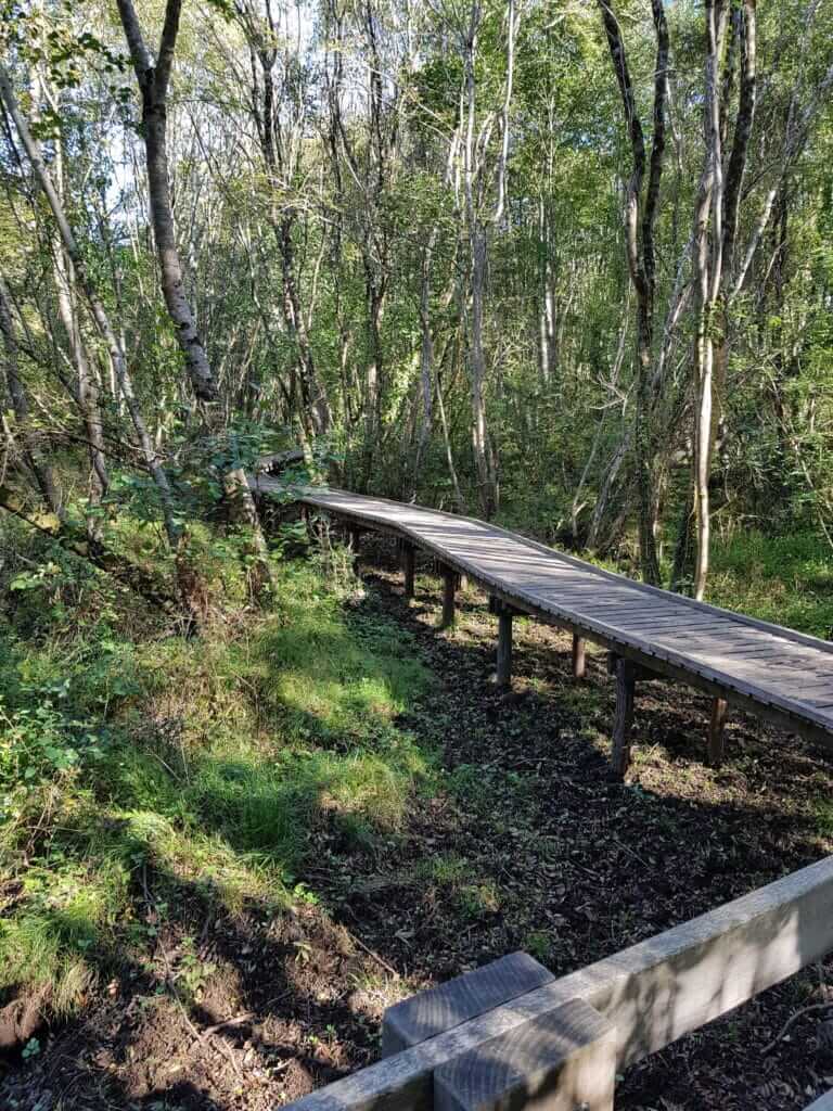 Après, nous trouvons un joli pont nous permettant de franchir le courant de Sainte-Eulalie. On s’engage à ce point dans la zone humide des Forges. C’est une section très sympa à faire car on marche au moins une centaine de mètres sur un sentier en bois surélevé.