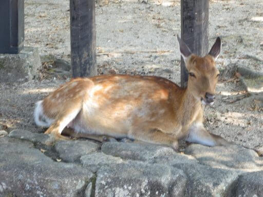 Puis, nous avons continué notre promenade sur une grande allée, très agréable, qui borde la baie et le village. Des cerfs ( Nihonjika ) se prélassent à l’ombre sur le chemin. On en compte 200 en liberté dans le village et 500 en tout sur l’île.